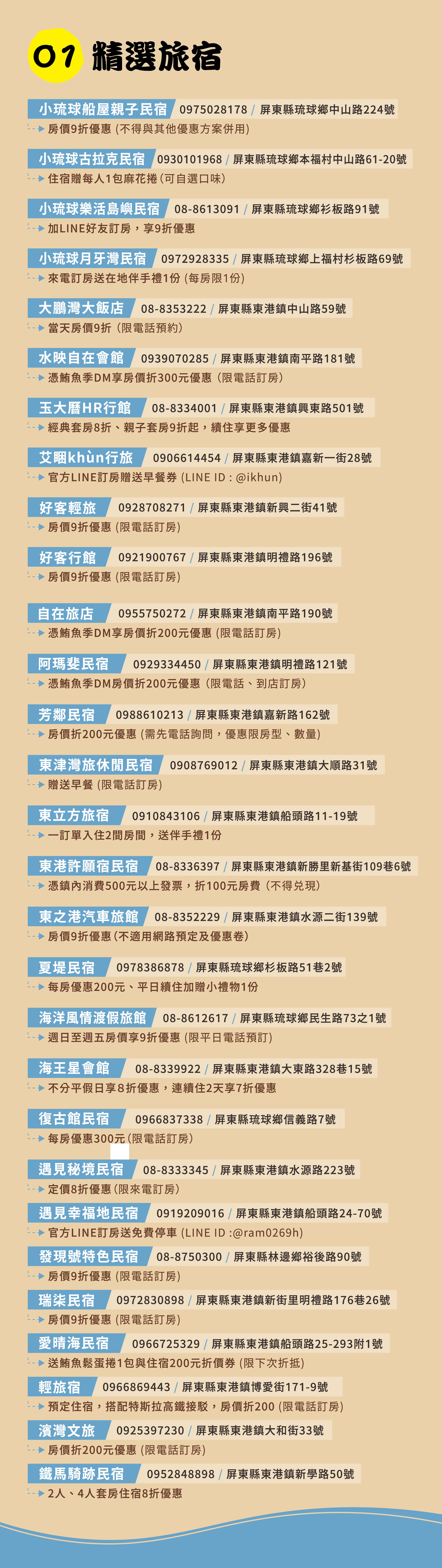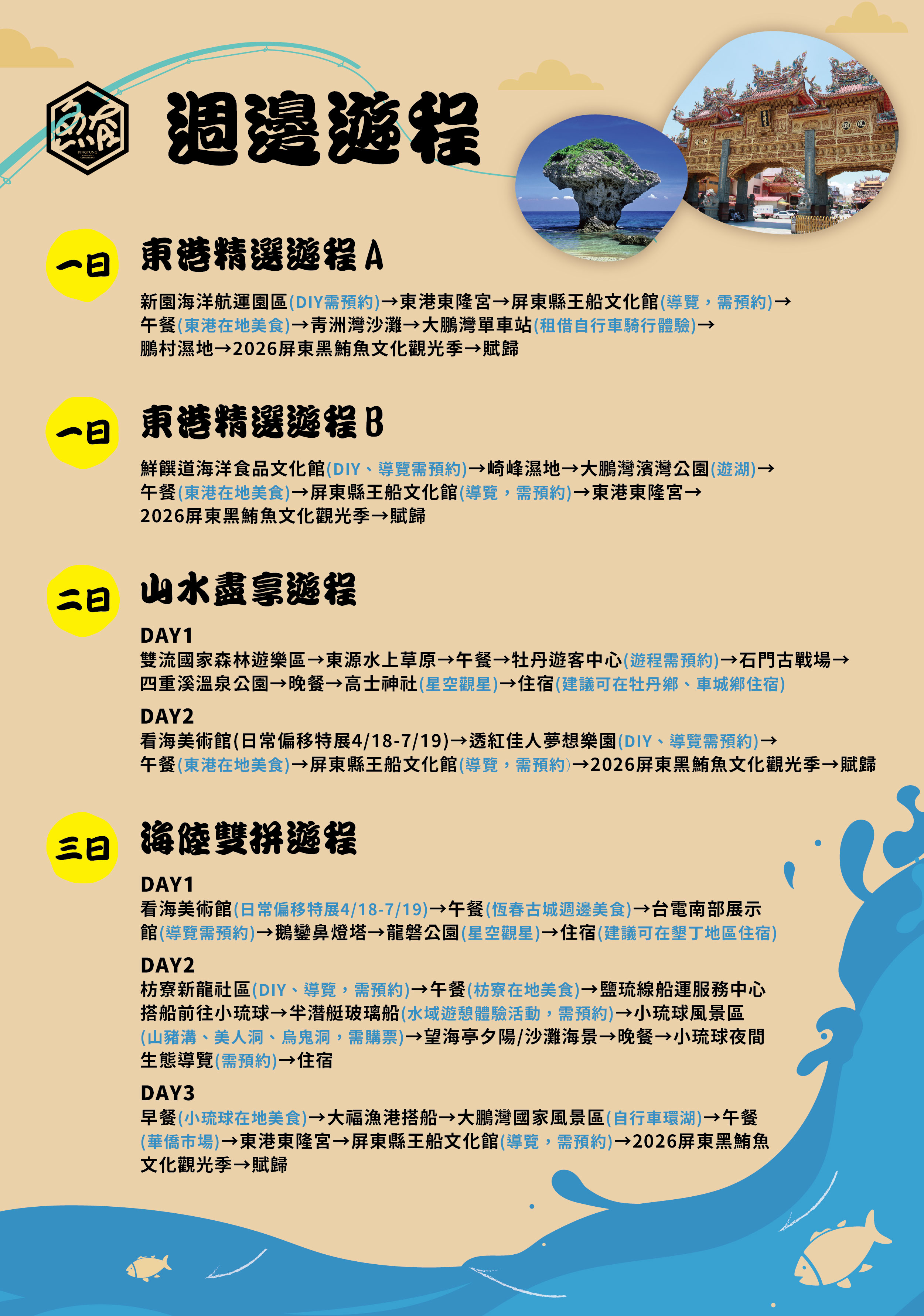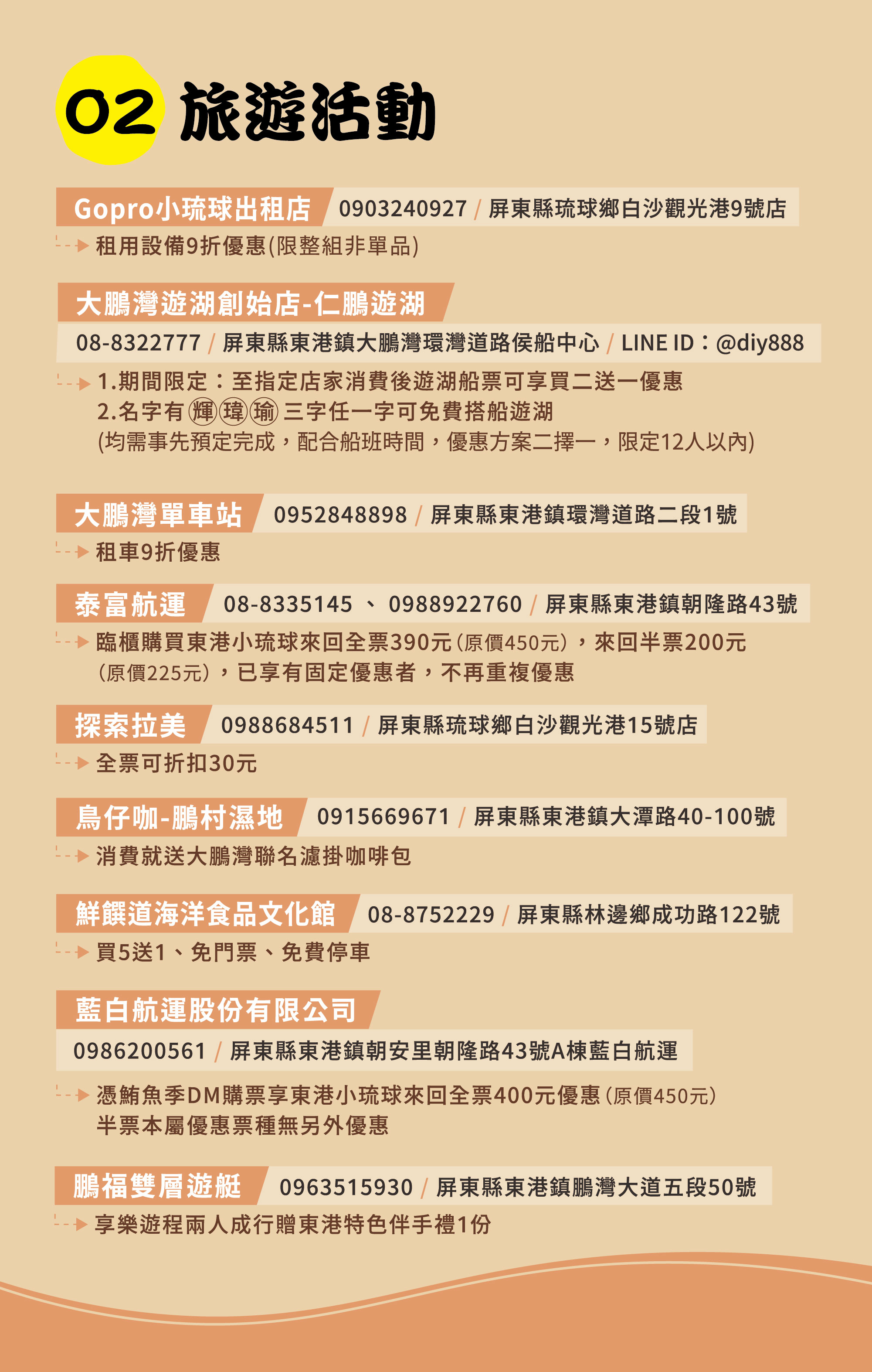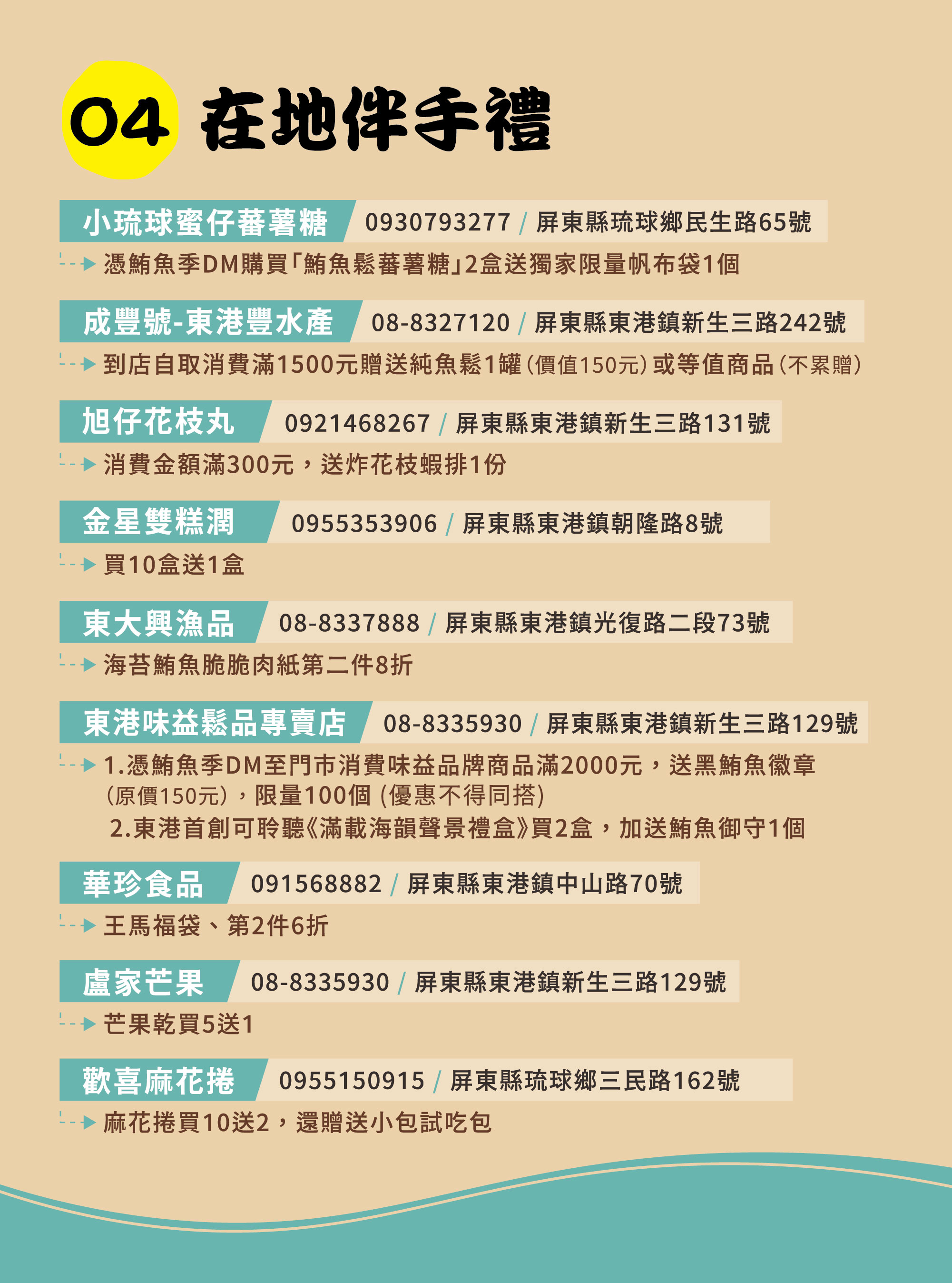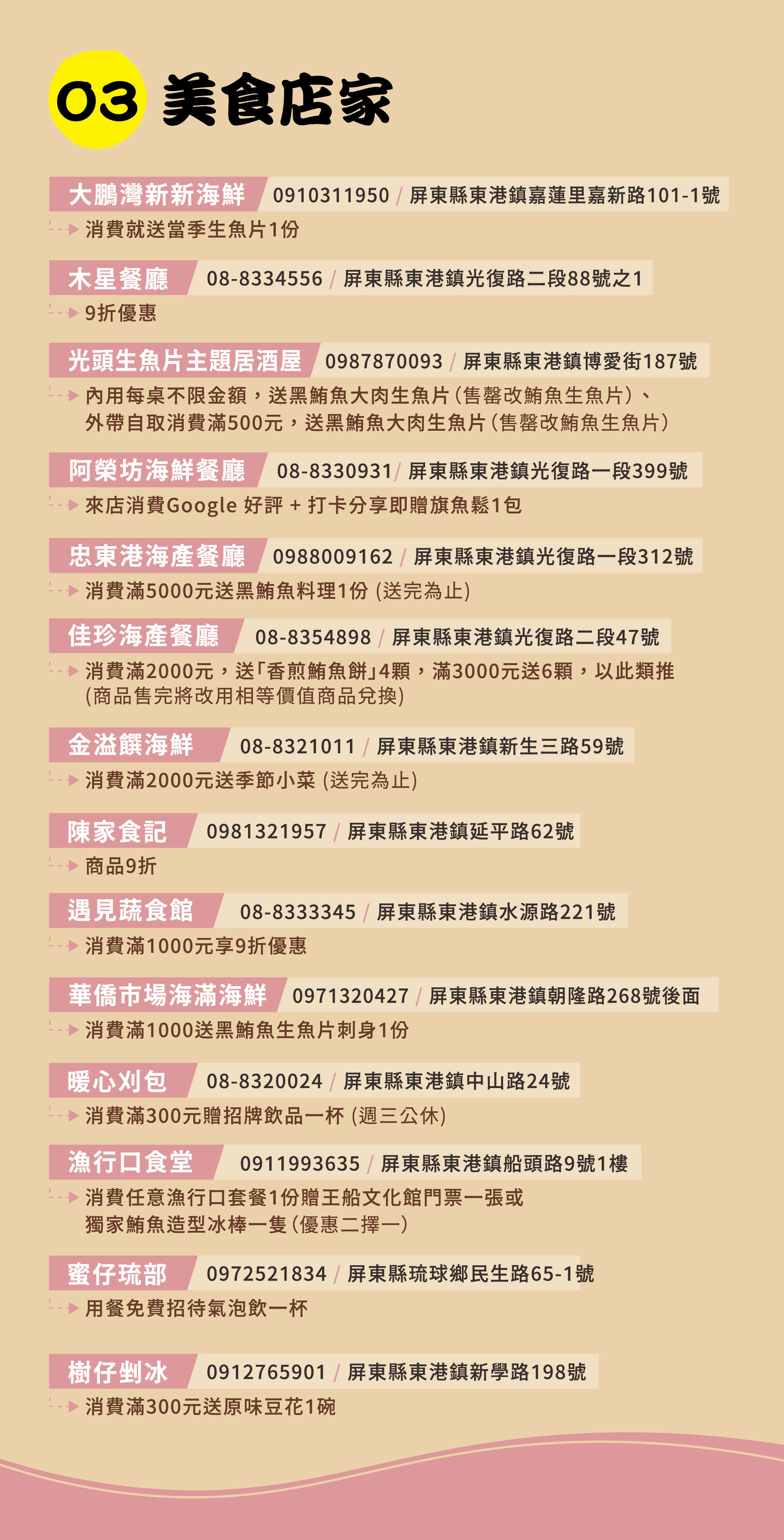 黑鮪魚文化觀光季活動期間精選在地特約店家推出優惠,含括住宿、旅遊、美食、伴手禮,出示活動摺頁(紙本/電子)即可享有各項好康 。