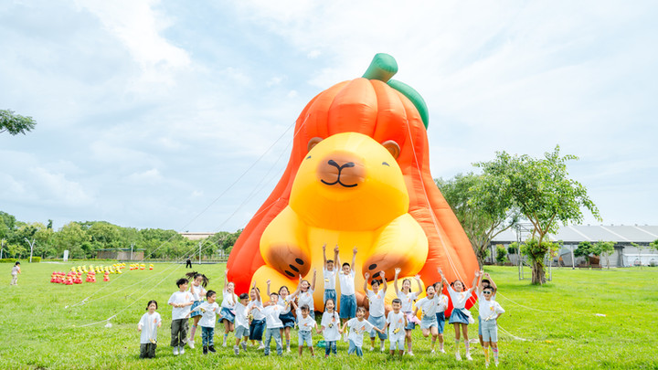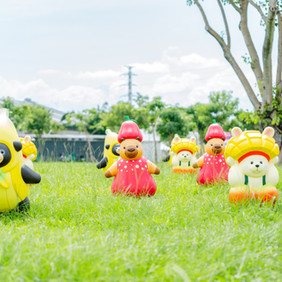 縣民公園三層水池及草地上甜蜜大型氣球,以及多隻可愛的水果夥伴分散在草地上等你合照